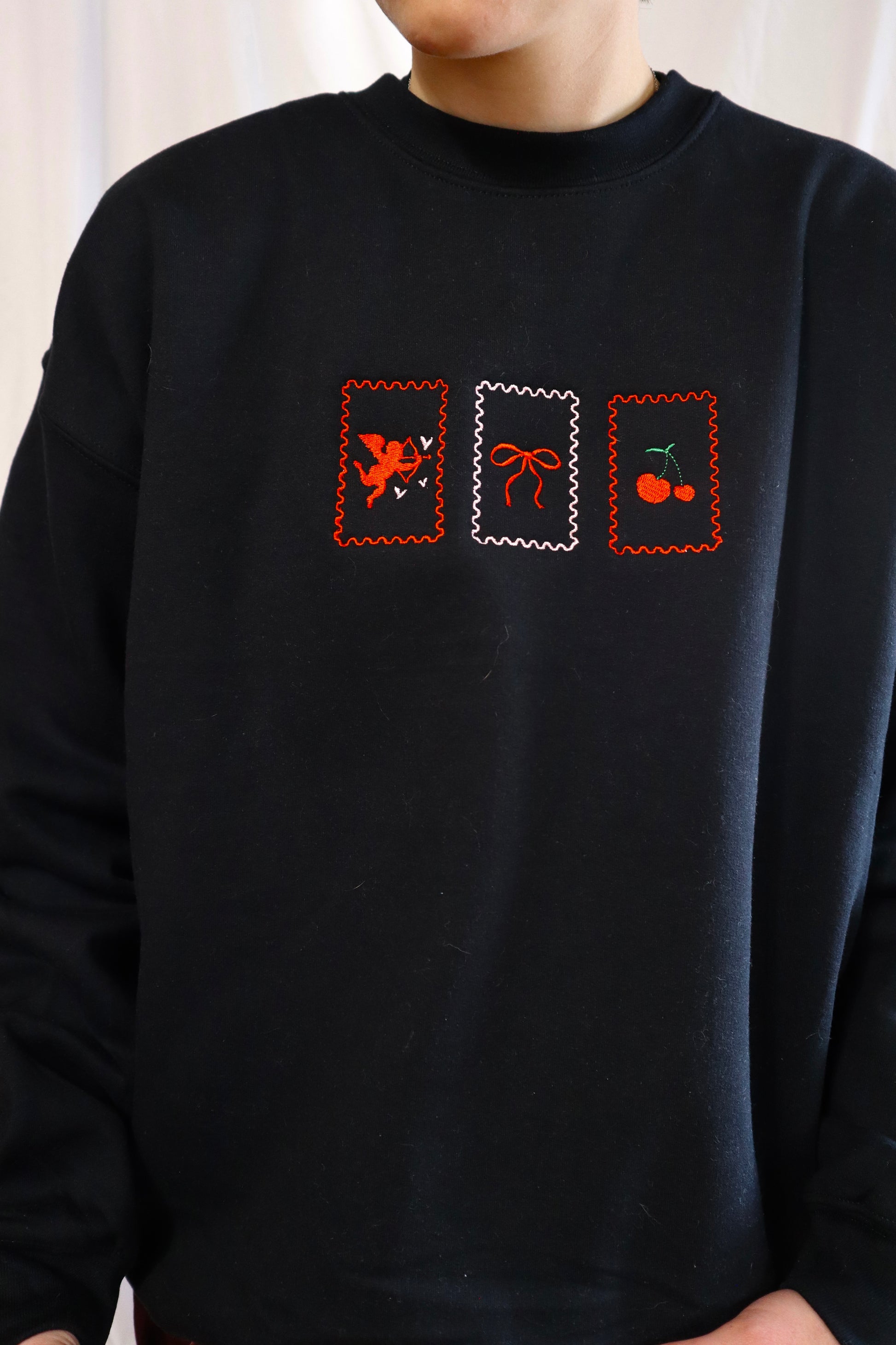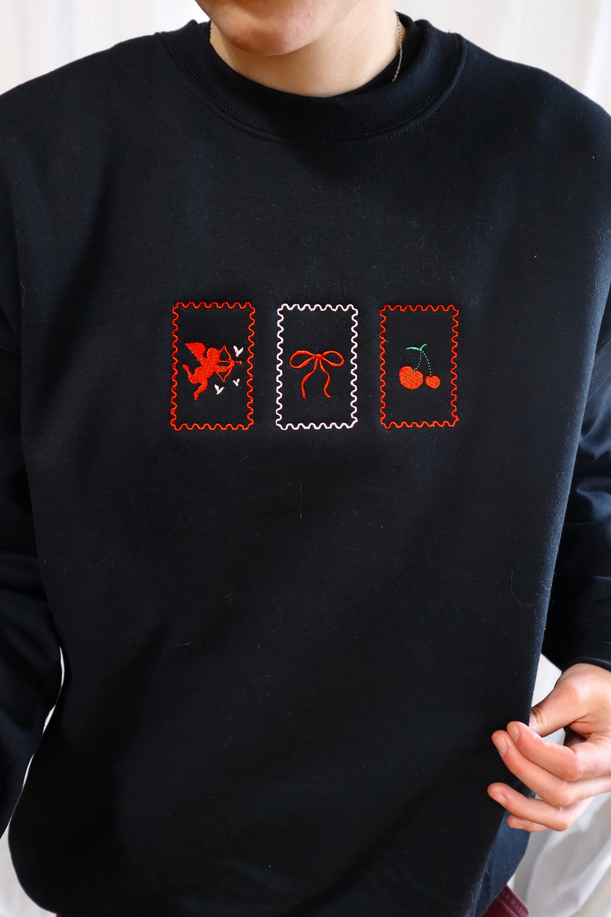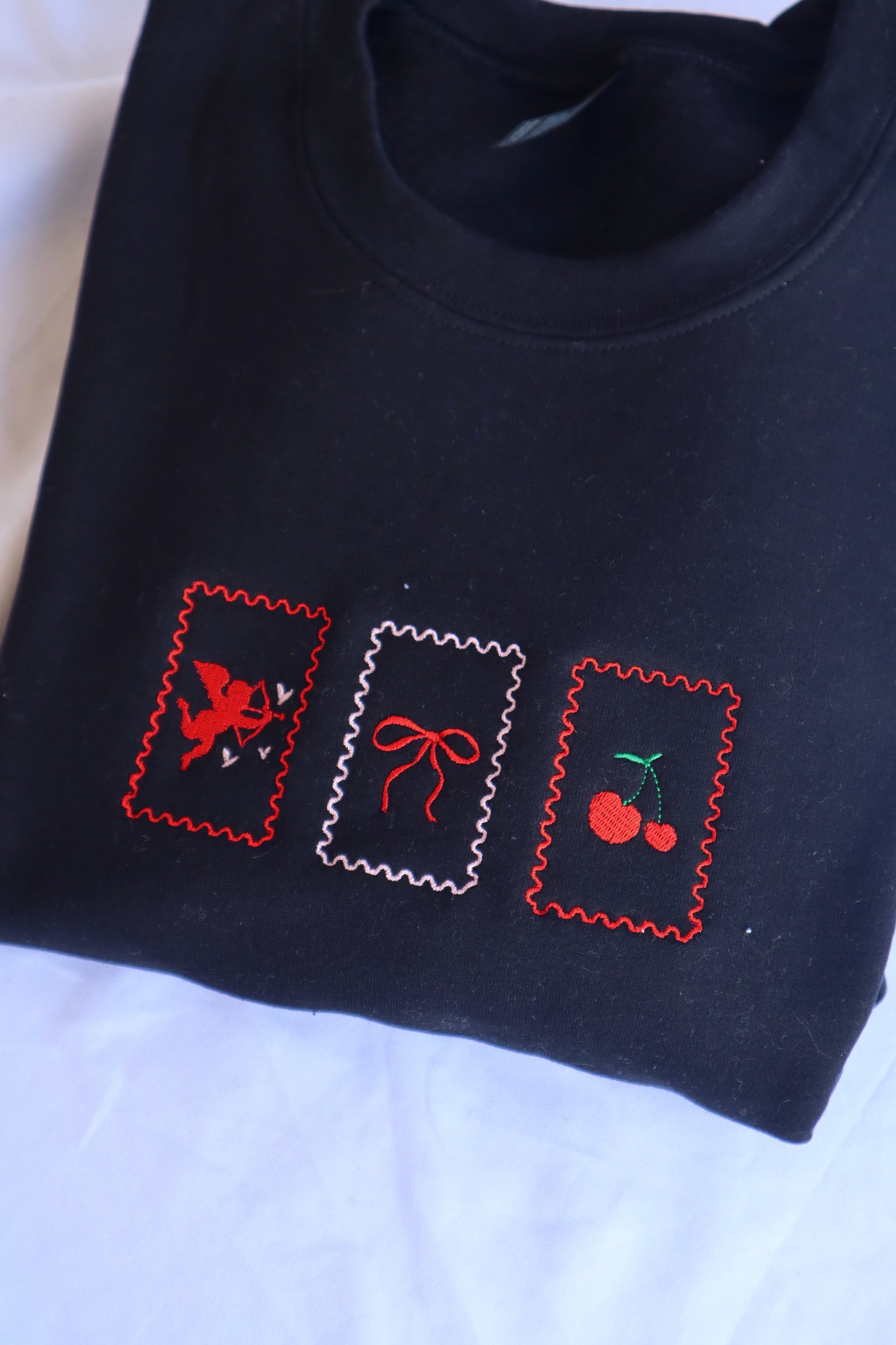 Embroidered Valentine's Day "Valentine's Postage, Angel, Bow, Cherries", Hoodie or Crew Neck, Long Sleeve, Classic fit, Unisex, Adult