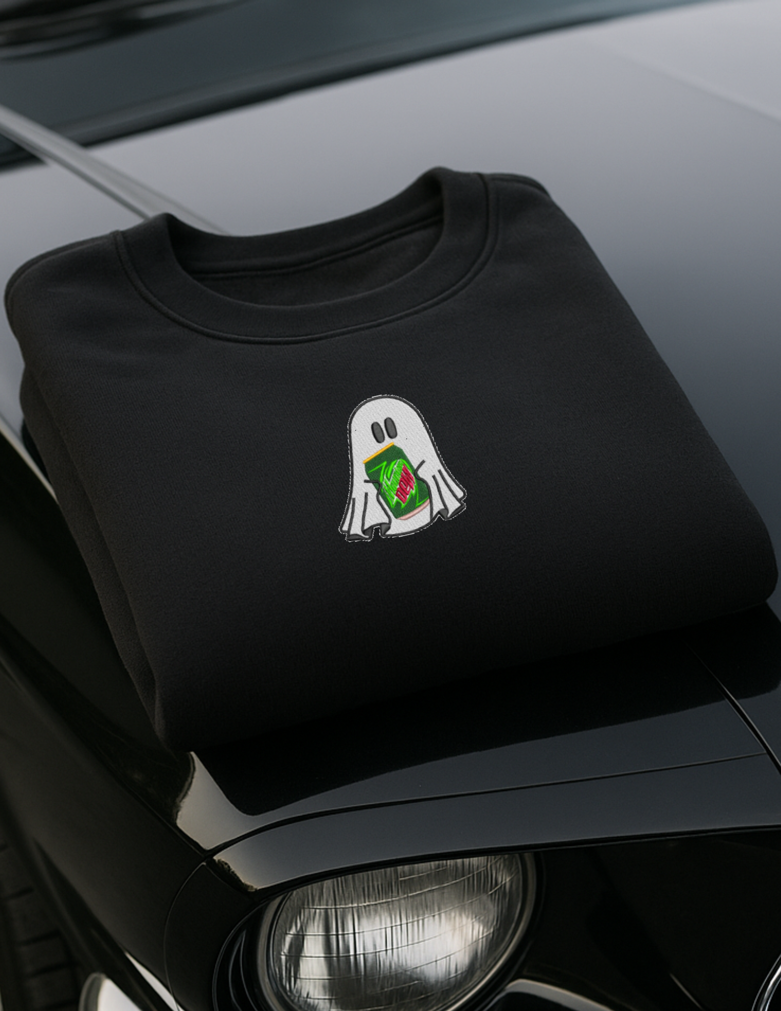 👻 Ghost Mountain Dew – Embroidered Hoodie or Crewneck Sweet, spooky, and soda-charged. This Gildan sweatshirt features an embroidered ghost sipping a Mountain Dew—equal parts adorable and electric.