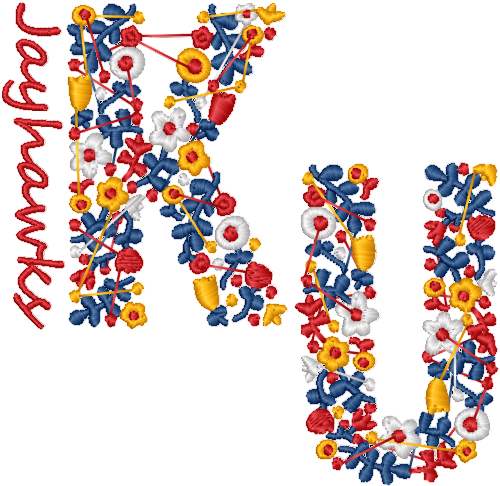 This digital embroidery file features the KU Jayhawks logo with elegant floral accents, perfect for creating stunning custom apparel and accessories.