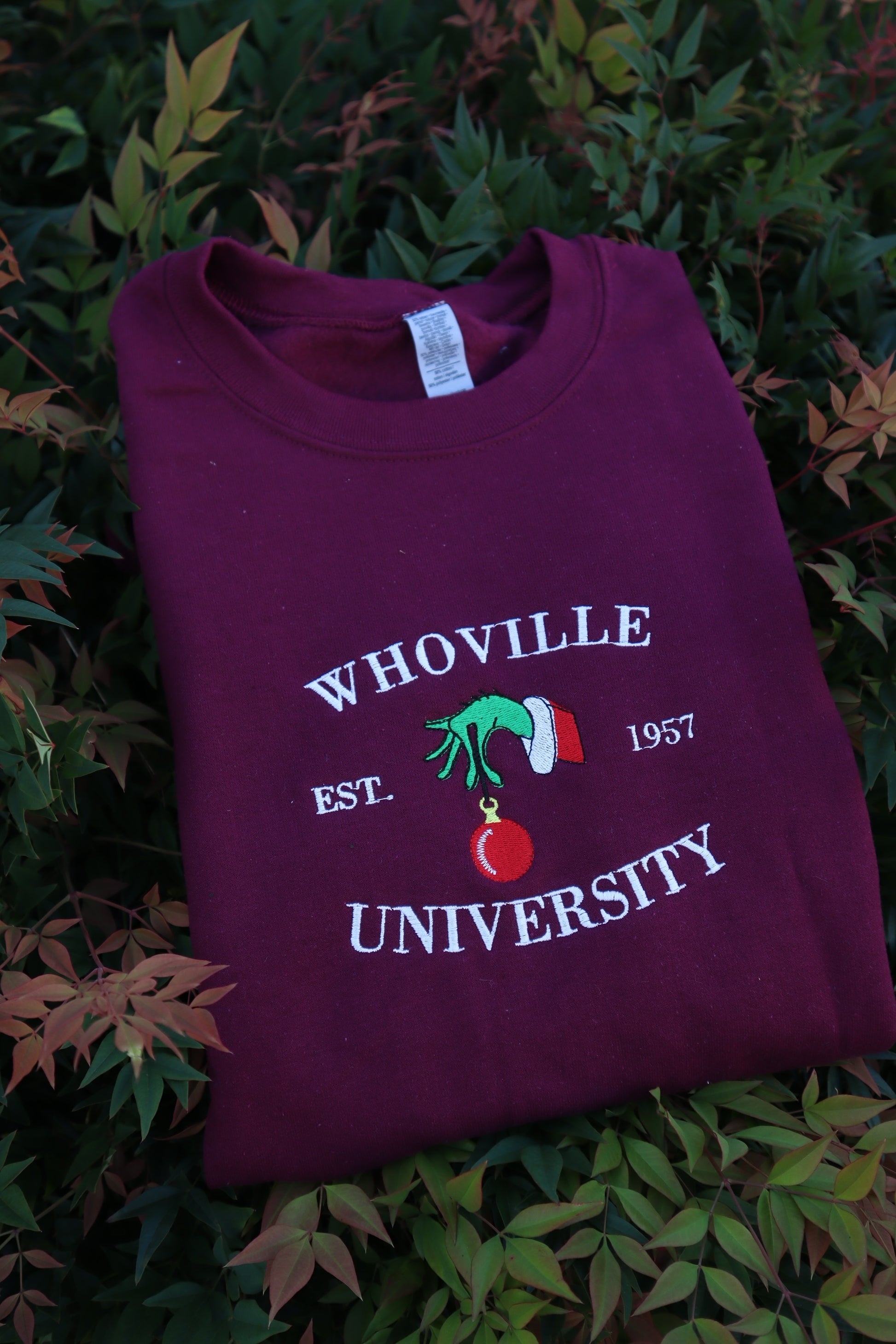 Embroidered Whoville University, Hoodie or Crew Neck Sweatshirt, Long Sleeve, Classic Fit, Unisex Adult